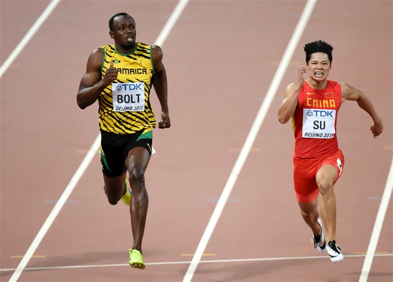 新华社照片,北京,2015年8月23日,牙买加选手博尔特(左)和中国选手苏炳添在比赛中。\n 当日,在北京国家体育场“鸟巢”进行的2015年国际田联世界田径锦标赛男子100米半决赛中,牙买加选手博尔特以9秒96的成绩晋级决赛。\n 新华社记者王昊飞摄