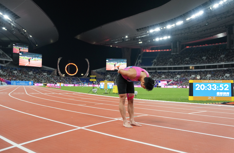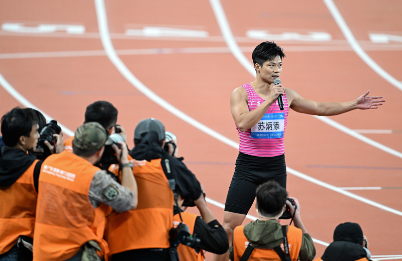 新华社照片,广州,2025年11月20日\n 11月20日,广东队选手苏炳添在比赛后向观众致意。\n 当日,第十五届全国运动会田径项目男子4X100米接力决赛在广州举行。\n 新华社记者 江汉 摄